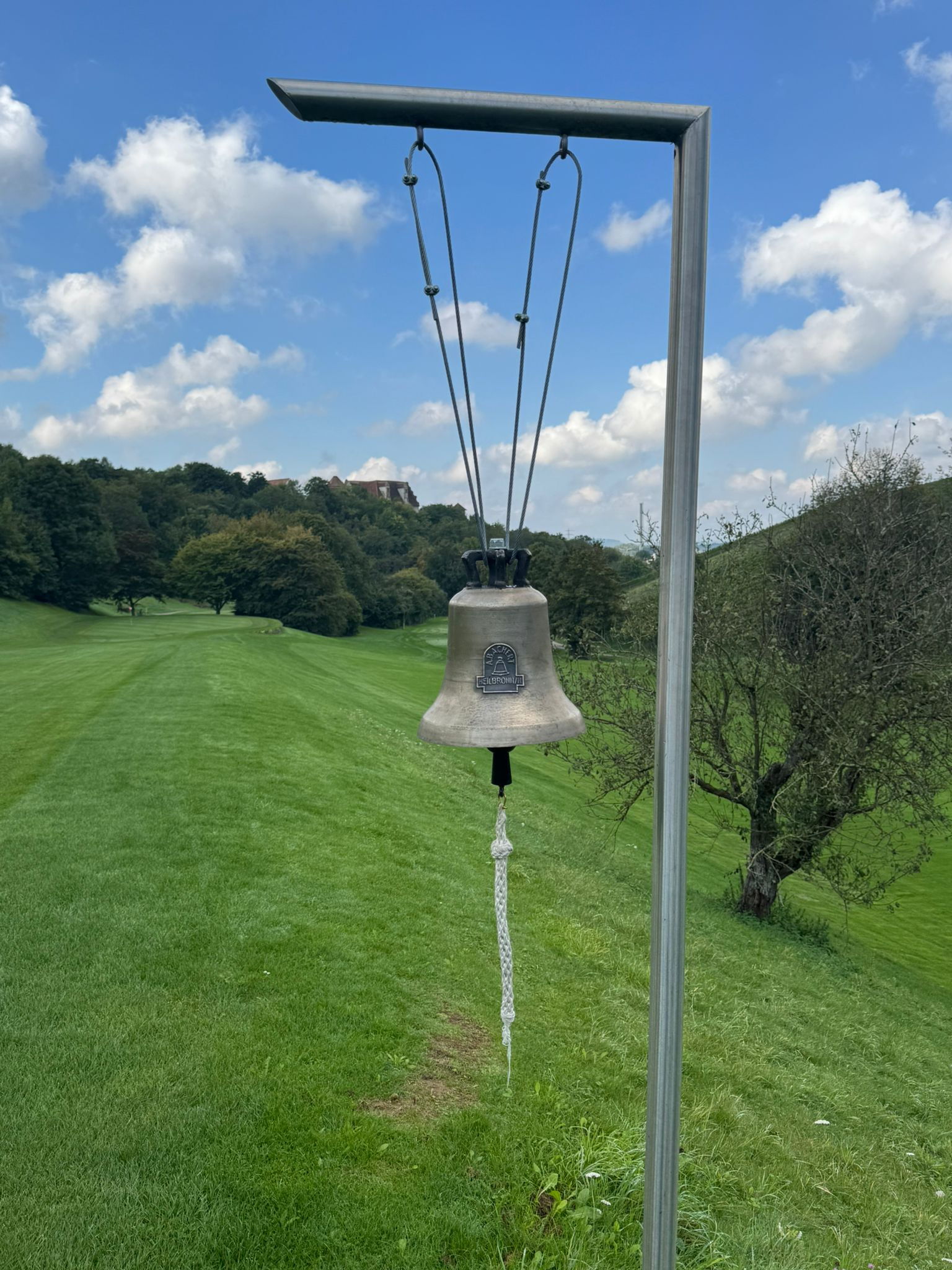 Ein Jahr nach dem Verschwinden konnten wir die neue Glocke aufhängen und haben nun wieder ein unüberhörbares Signal zur Freigabe des 2. Abschlags auf dem Roten Platz.